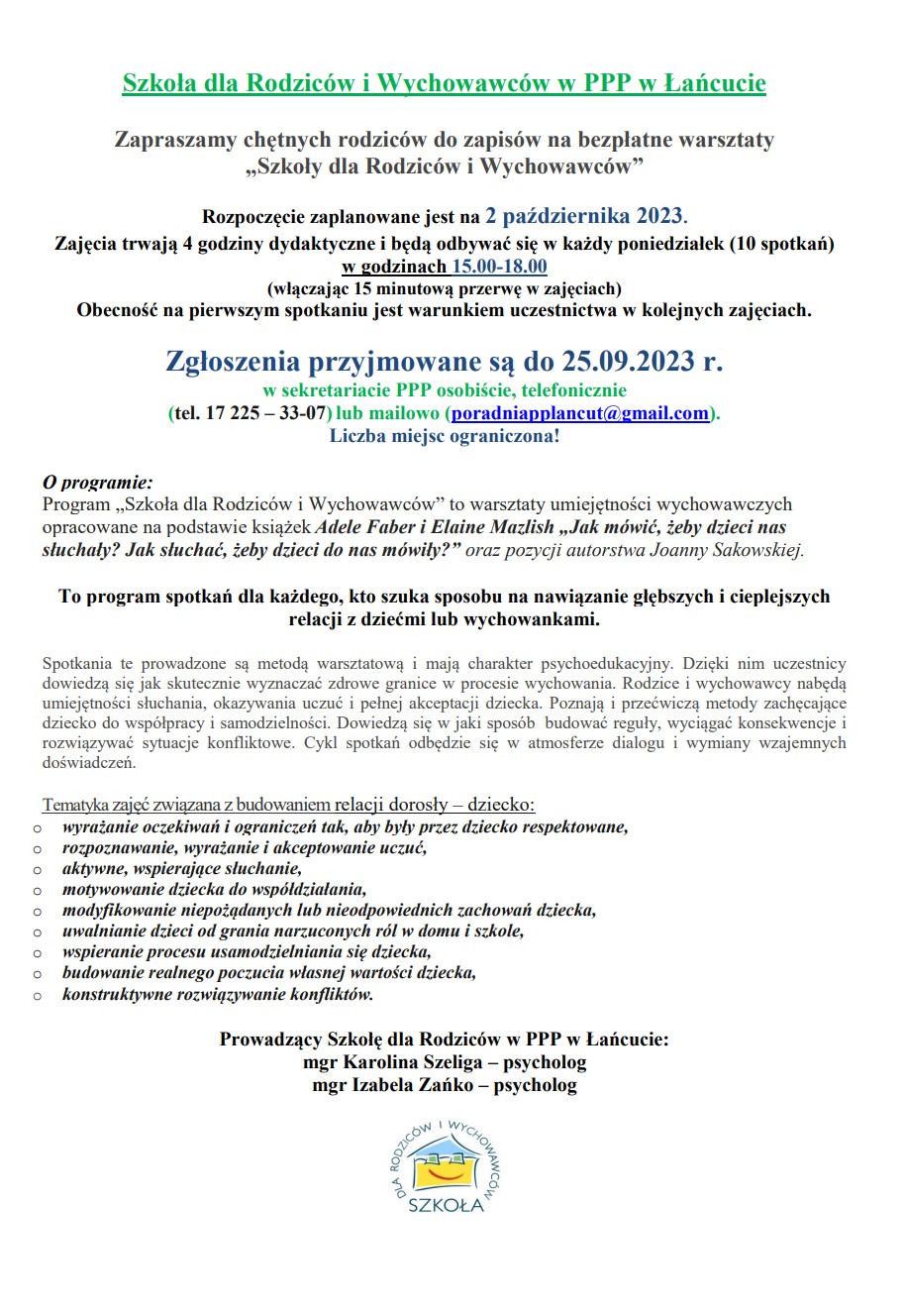 Serdecznie zapraszamy Rodziców, Opiekunów dzieci z autyzmem na grupę wsparcia, do naszej Poradni. Najbliższe spotkanie grupy odbędzie się 25.01.2024 r. o godz. 15.00. Warunkiem uczestnictwa jest zgłoszenie telefoniczne: 17 225 33 07, 508 848 576 lub e-mail: b.szal@ppplancut.pl k.czapla@ppplancut.pl Czytaj więcej …